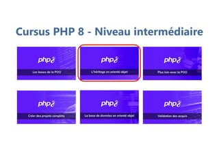 La formation PHP 8 sur l'héritage en programmation orientée objet vise à enseigner les concepts d'héritage, de classes parentes et enfants, d'abstraction, ainsi que l'utilisation de classes et méthodes finales. Destinée aux étudiants et autodidactes ayant des connaissances en HTML, CSS et PHP procédural, elle comprend plusieurs projets pratiques pour appliquer les principes appris. La formation se termine par un bilan et des indications sur les formations futures.