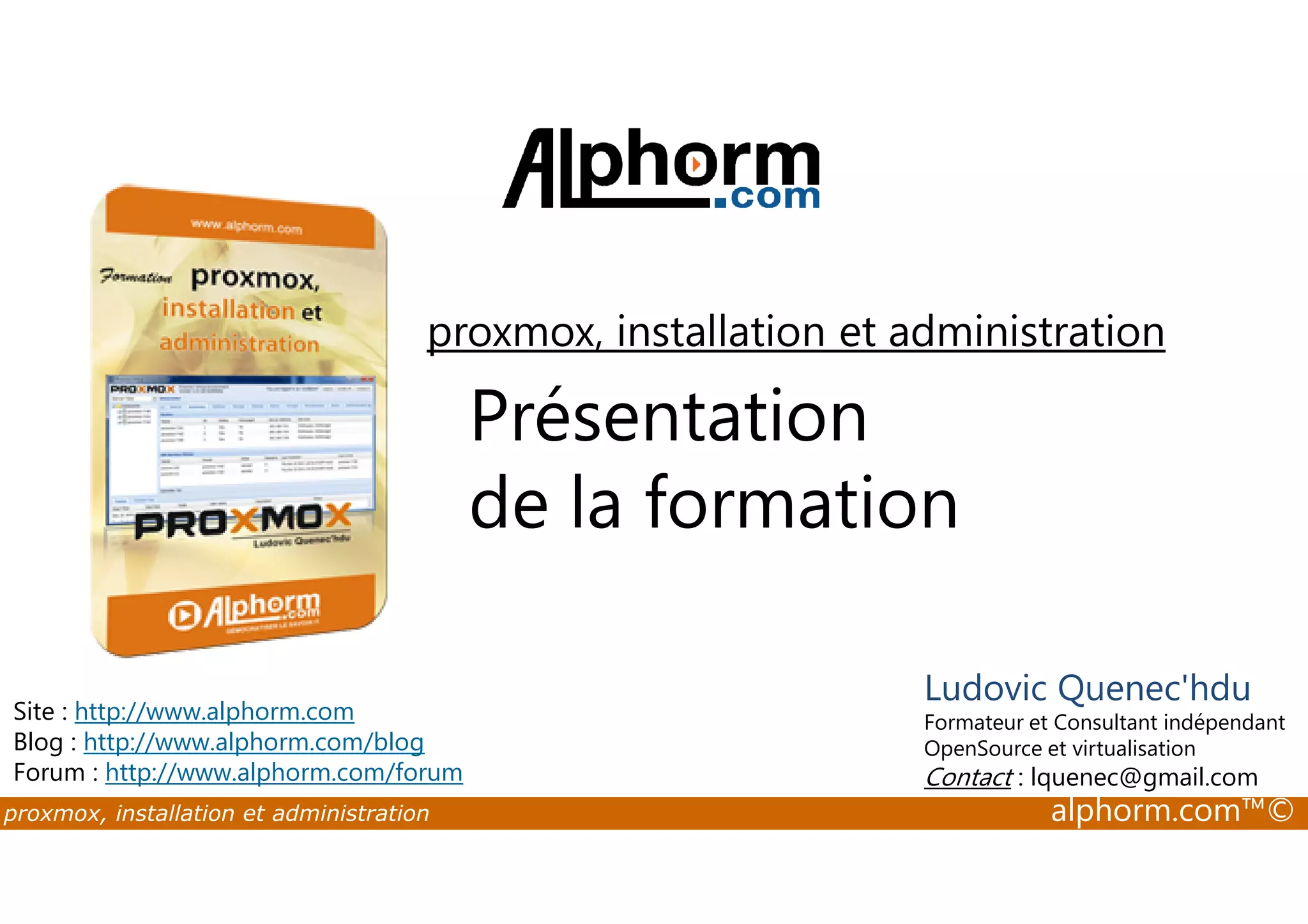 Le document présente une formation sur l'installation et l'administration de Proxmox VE 3.x, une solution de virtualisation open source. Il couvre les objectifs, le public concerné, le plan de formation, ainsi que les technologies et services associés à Proxmox. La formation vise à enseigner la gestion des machines virtuelles, la configuration de clusters et l'optimisation de l'infrastructure.