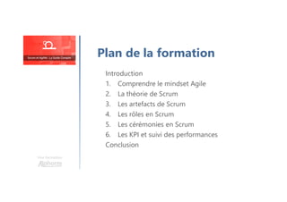 Le document présente un guide complet sur la formation scrum et agilité, couvrant les principes fondamentaux, les rôles, les cérémonies, ainsi que les artefacts de scrum. Il met en avant l'importance de l'approche agile pour s'adapter aux besoins changeants des clients et améliorer la réussite des projets. La formation s'adresse à divers profils professionnels souhaitant acquérir des connaissances en agilité et maximiser la valeur délivrée aux clients.