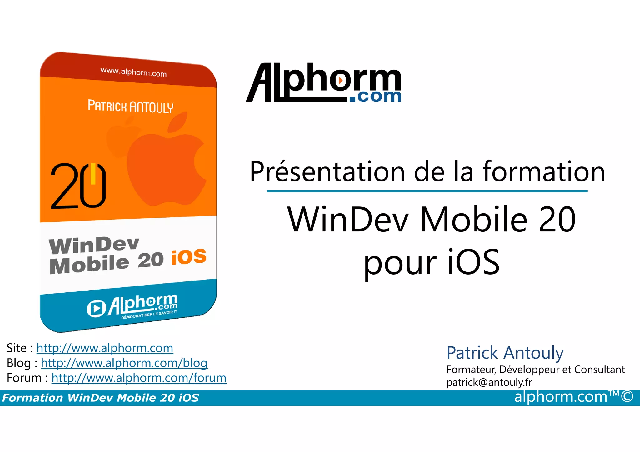 La formation Windev Mobile 20 pour iOS, animée par Patrick Antouly, couvre le développement d'applications mobiles, avec un accent particulier sur la création d'un projet de gestion de budget. Elle inclut des modules sur la configuration de l'environnement de développement, l'utilisation de bases de données HFSQL et les règles d'IHM pour iOS. Destinée aux développeurs et décideurs en mobilité, elle nécessite des connaissances préalables en développement informatique.