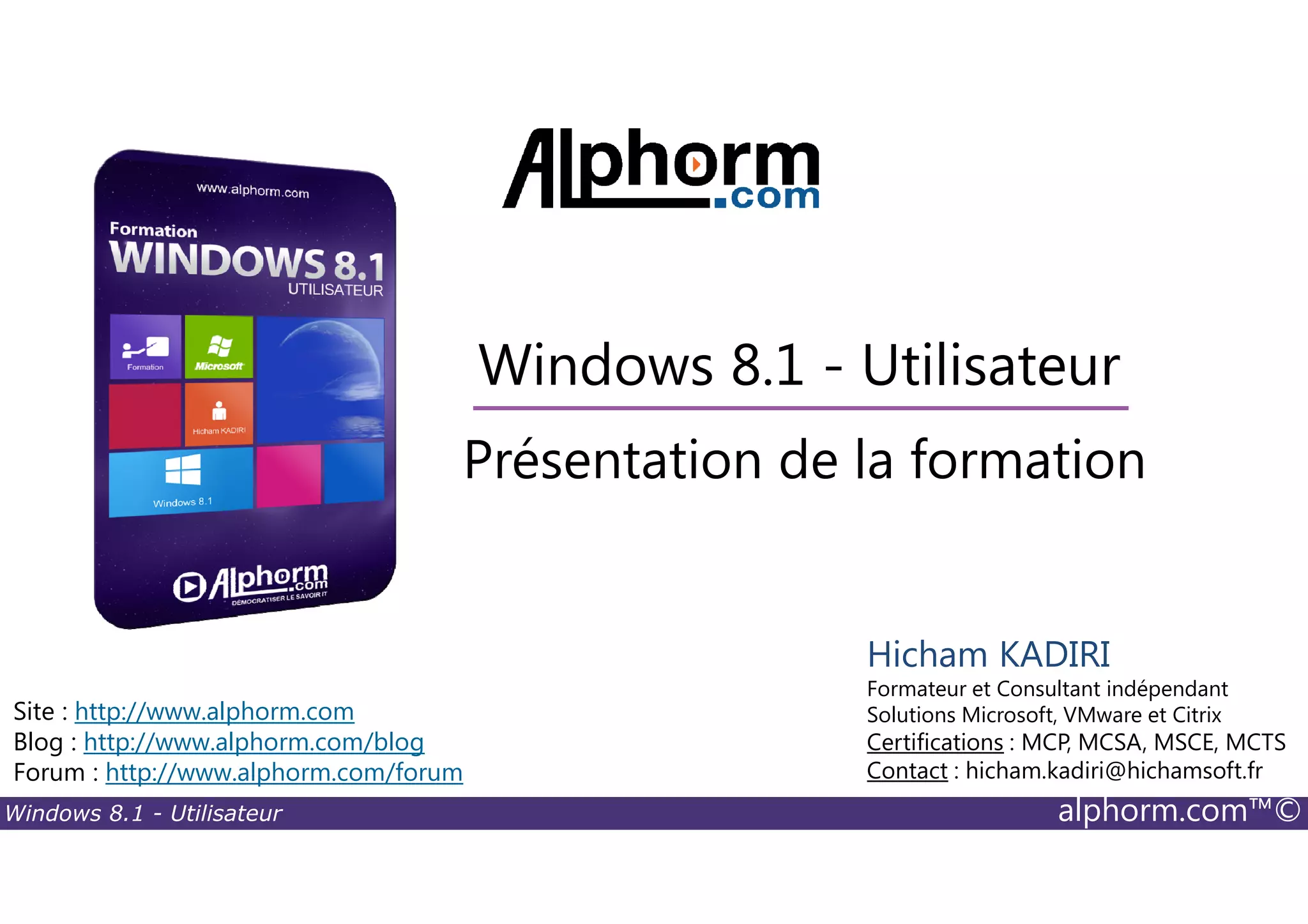 Ce document présente une formation sur Windows 8.1, animée par Hicham Kadiri, consultant et formateur certifié Microsoft. La formation couvre les fonctionnalités et l'interface de Windows 8.1, ainsi que les compétences requises pour y participer. Les publics cibles incluent des assistantes de direction, des secrétaires, et toute personne souhaitant maîtriser Windows 8.1.