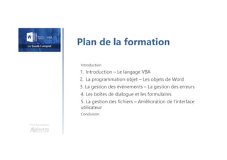 La formation de Pascale Boussard sur MS Office Word 2016 VBA couvre les aspects essentiels du développement en VBA, y compris la programmation orientée objet, la gestion des événements et des erreurs, ainsi que la création de formulaires et d'interfaces utilisateurs. Destinée à toute personne souhaitant automatiser des tâches dans Word, elle propose une approche pratique avec des exercices à chaque étape. La formation vise à fournir des compétences solides en VBA à travers des mini-projets et des corrections d'exercices.
