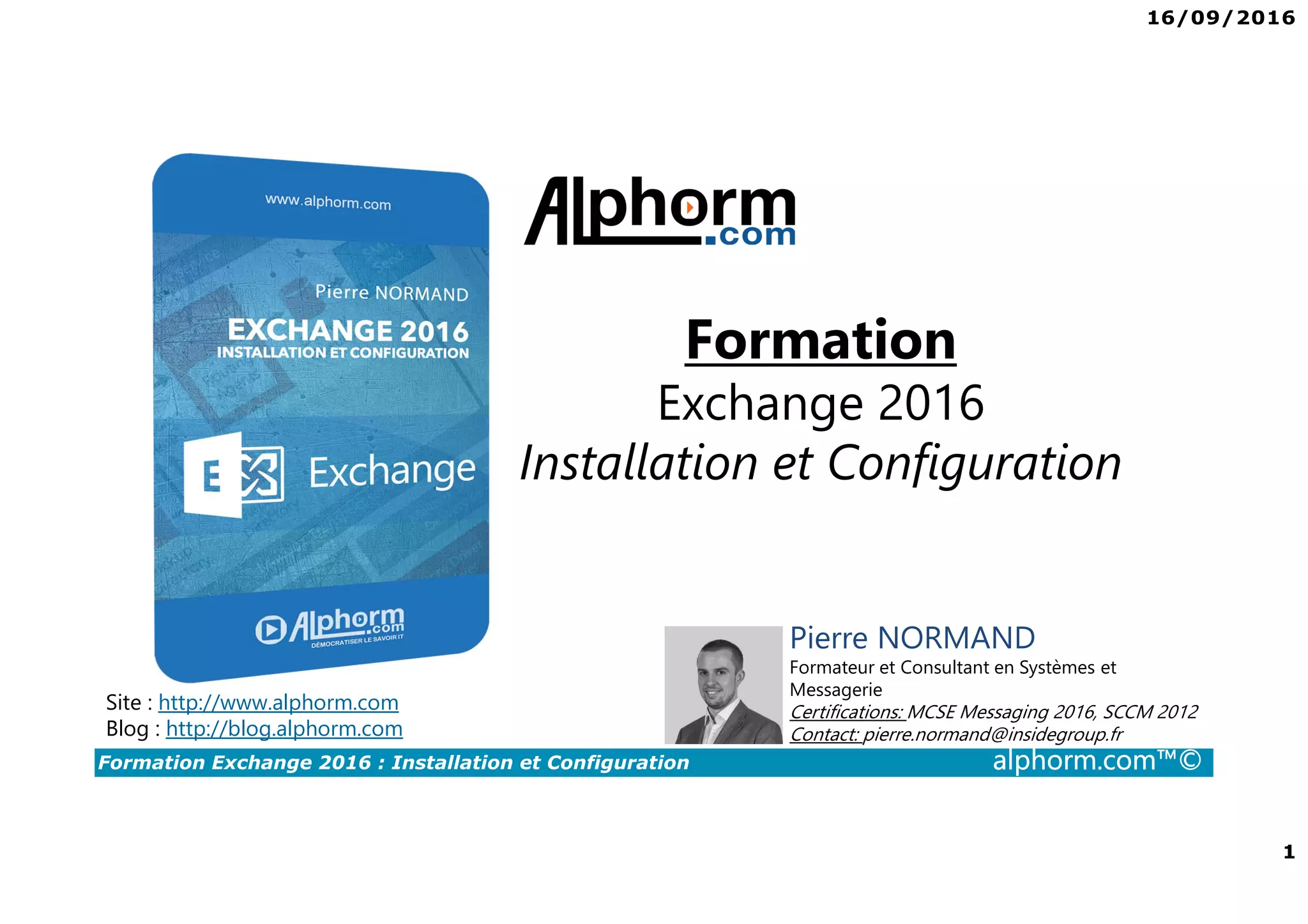 La formation Exchange 2016 couvre l'installation et la configuration du logiciel de messagerie professionnelle, destinée aux administrateurs souhaitant apprendre à déployer et configurer Exchange 2016. Les prérequis incluent des connaissances sur les systèmes d'exploitation Windows Server, TCP/IP, et Active Directory. Le contenu comprend des chapitres sur l'installation, l'administration, la configuration des boîtes aux lettres, la gestion de la sécurité, et d'autres fonctionnalités essentielles.