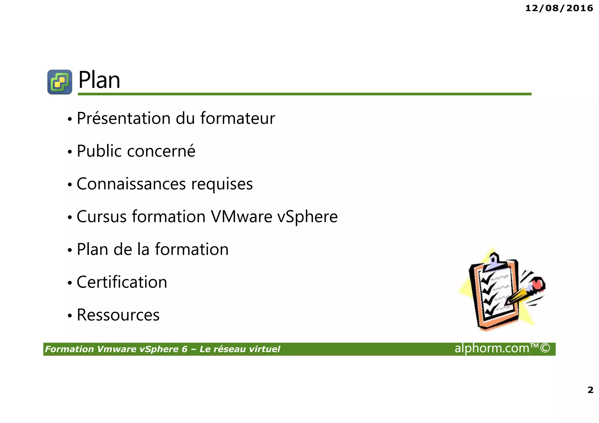 Le document présente une formation sur VMware vSphere 6, axée sur le réseau virtuel, destinée aux administrateurs vSphere et à ceux souhaitant acquérir des compétences en virtualisation. Il décrit les prérequis techniques, le cursus de formation, ainsi que les certifications disponibles comme le VCP6. Des ressources supplémentaires pour l'apprentissage et la pratique, ainsi qu'une introduction aux concepts clés de la virtualisation sont également fournies.
