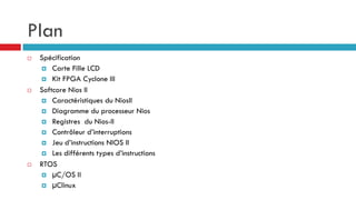 Le document traite d'un kit d'évaluation Nios II d'Altera, incluant les spécifications d'une carte fille LCD, d'un kit FPGA Cyclone III et de diverses caractéristiques du processeur Nios II. Il aborde également les systèmes d'exploitation temps réel comme μc/os II et μclinux, et fournit des détails sur des outils de développement comme Quartus II et SOPC Builder. Enfin, il présente un exemple d'implémentation d'une machine d'état logique montrant la prise en charge des instructions et des fonctionnalités de base du processeur.