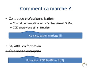 Le document explique le fonctionnement d'un contrat de professionnalisation entre l'entreprise et l'ISIMA, avec un calendrier d'alternance et des obligations pour les étudiants et les entreprises. Il aborde également les informations financières, les responsabilités de chaque partie, ainsi que les règles concernant les absences et la communication. Enfin, il souligne l'importance du tuteur et de la planification des activités académiques et professionnelles.