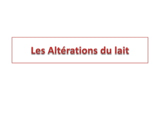 Le document traite des altérations microbiologiques, enzymatiques et chimiques du lait, causées par divers micro-organismes et facteurs environnementaux. Parmi ces altérations, on trouve l'acidification, le rancissement et la putréfaction, qui affectent la saveur et la qualité du lait. Certaines altérations enzymatiques peuvent être bénéfiques pour la production de produits laitiers, tandis que d'autres peuvent entraîner une détérioration notable.