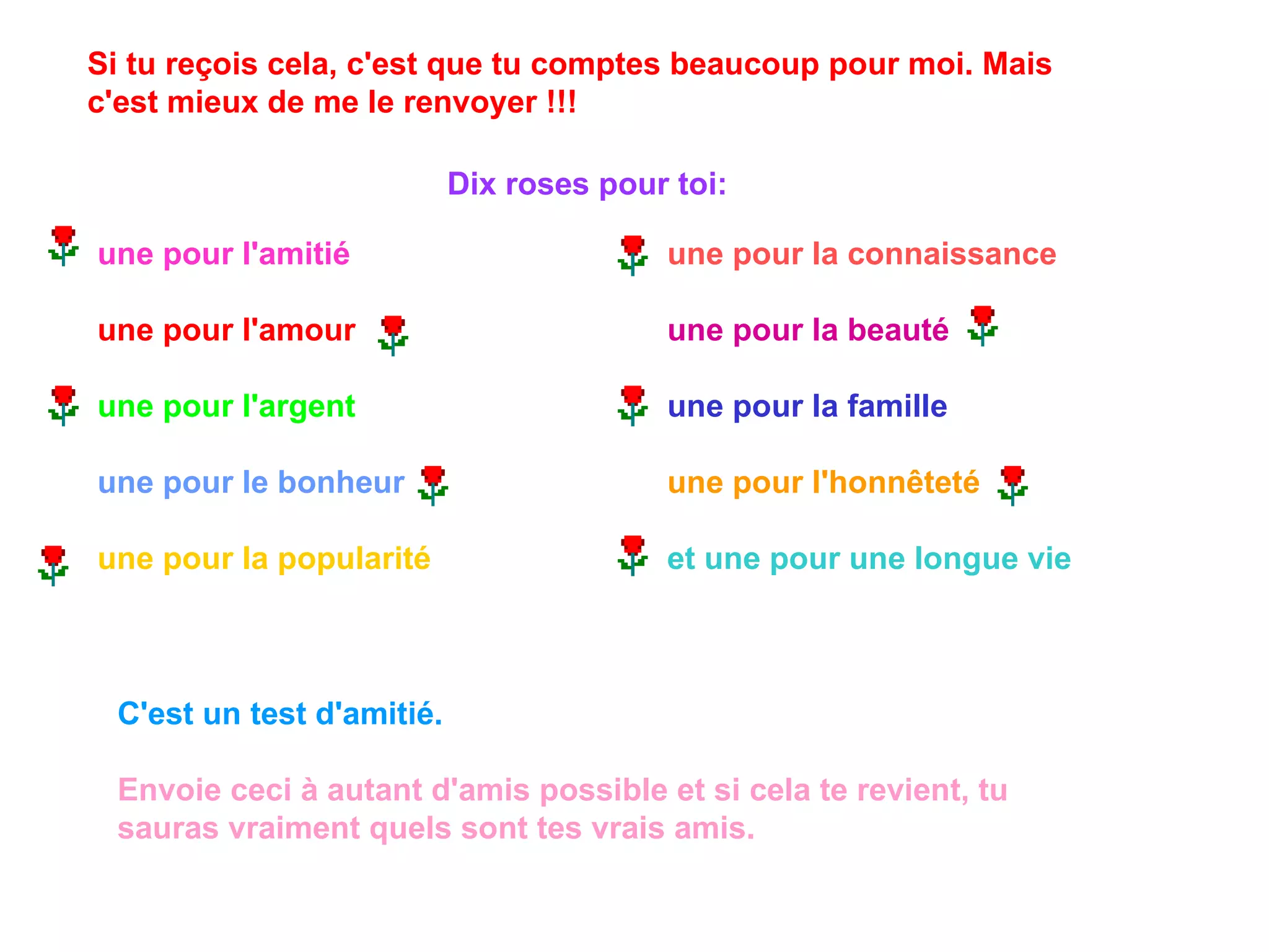 Ce document est un message de test d'amitié qui invite à renvoyer le message pour découvrir qui sont ses vrais amis. Il associe des roses à différents aspects de la vie et propose un système de souhaits basés sur le nombre de personnes contactées. Le texte célèbre les différences et les moments partagés entre amis.