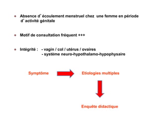 Le document traite de l'aménorrhée, caractérisée par l'absence de menstruations chez les femmes, en abordant ses étiologies, notamment endocriniennes et génétiques. Il décrit les démarches diagnostiques à travers des interrogatoires, des examens cliniques et paracliniques pour établir un diagnostic précis. Enfin, le document évoque les différentes formes d'aménorrhée, leurs causes et les stratégies de traitement appropriées.