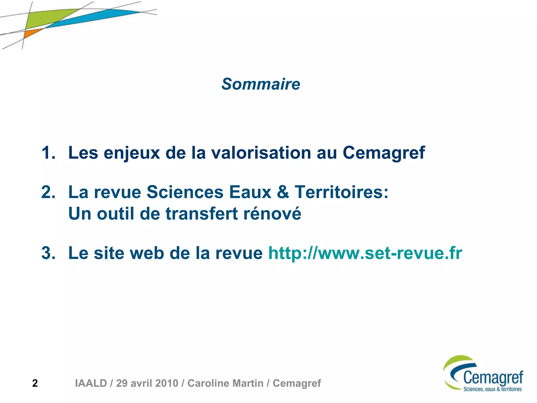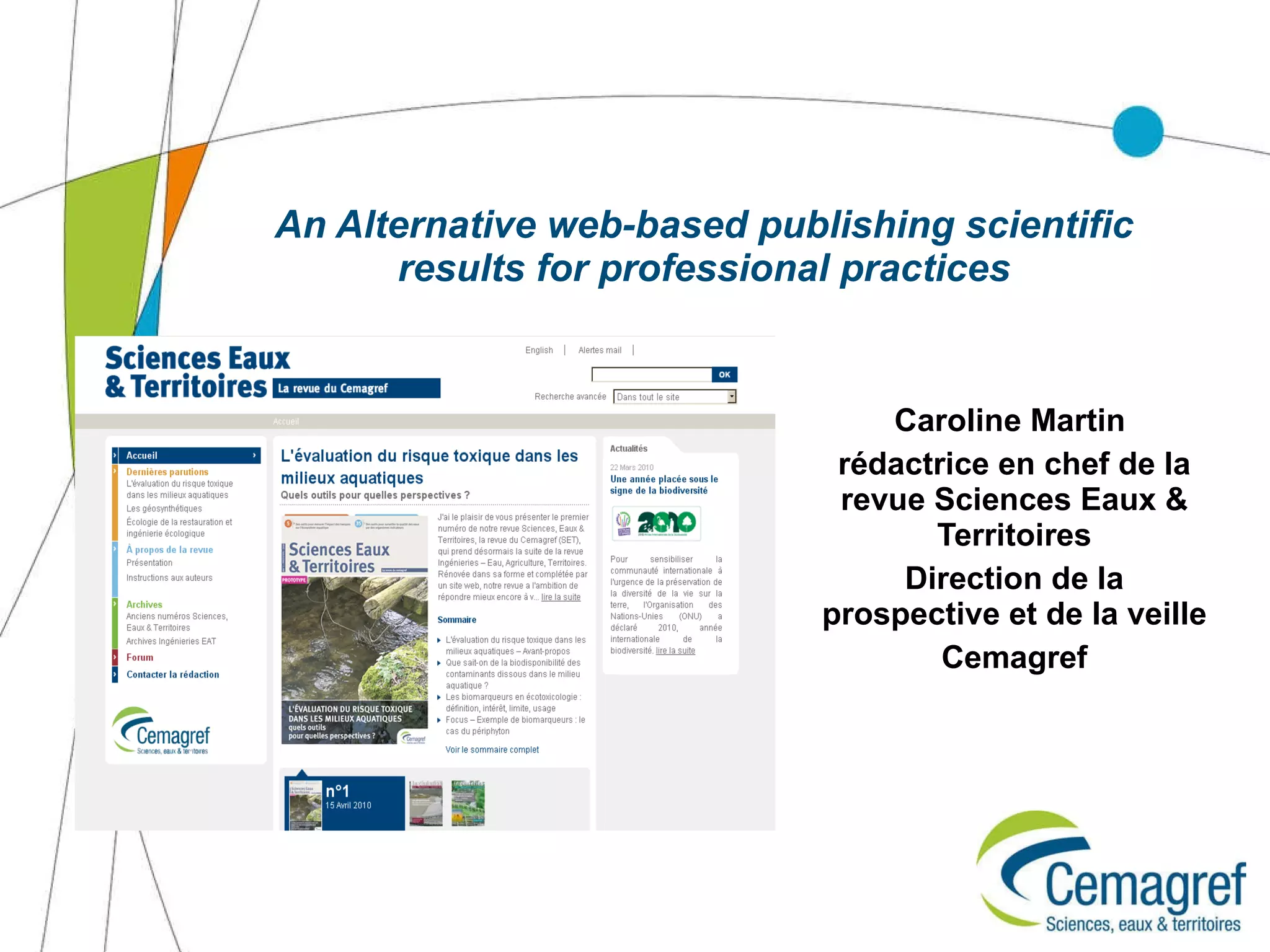Le document présente la revue 'Sciences eaux & territoires' comme un outil de valorisation des travaux de recherche du Cemagref, visant à renforcer les liens entre la recherche et le monde opérationnel. Il détaille la transition d'une revue papier à une plateforme électronique gratuite pour toucher un public plus large et diversifié, notamment les acteurs locaux et les décideurs techniques. Le site web associé sert d'interface interactive pour faciliter l'échange de connaissances entre chercheurs et praticiens.
