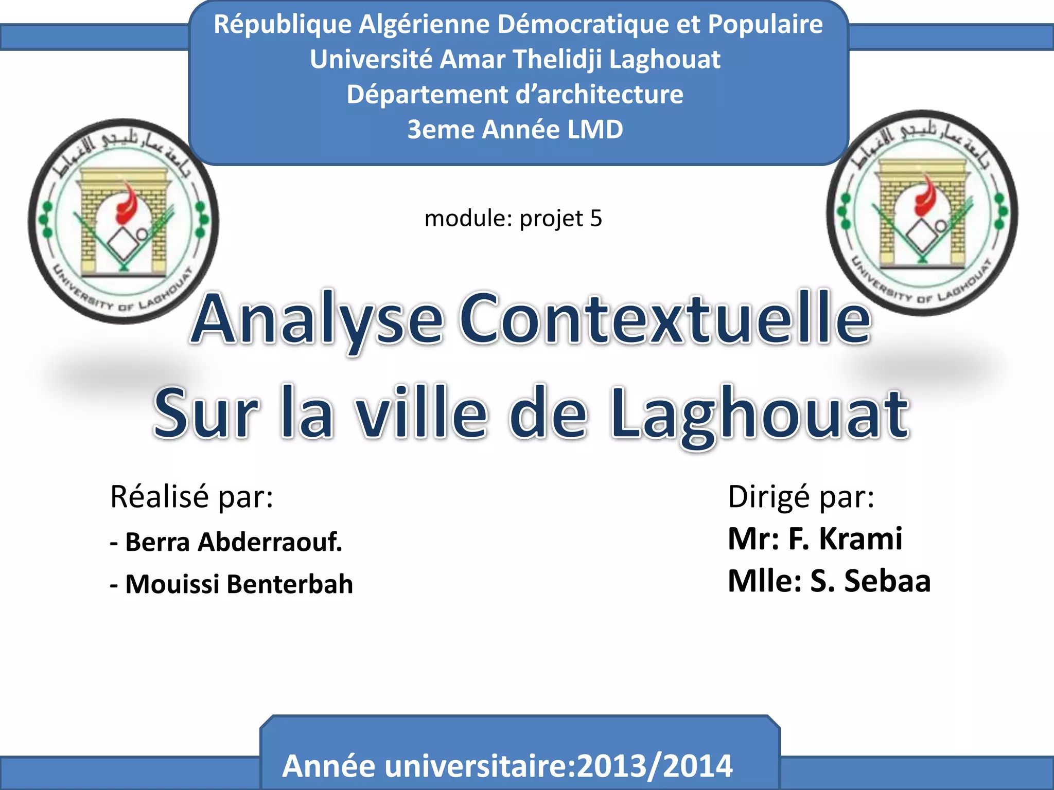 Ce document présente une étude urbaine sur la ville de Laghouat en Algérie, abordant son histoire, son développement spatial et ses caractéristiques climatiques et environnementales. Il analyse les potentiels et contraintes du site, tout en identifiant une problématique liée à l'absence d'équipements environnementaux et en proposant la création d'un centre de recherche environnementale. Le projet vise à améliorer la fonctionnalité et l'esthétique du quartier, en tenant compte des besoins de la communauté locale.