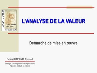 Le document présente un programme de formation sur l'analyse de la valeur, visant à approfondir les connaissances et maîtriser les outils nécessaires pour évaluer et augmenter la valeur d'objets à travers des méthodologies pratiques. Il aborde des notions de base concernant la valeur, une méthode structurée en plusieurs phases pour analyser les produits et services, et inclut des activités ludiques pour apprendre à évaluer et améliorer la valeur. Les étapes clés incluent l'orientation de l'action, la recherche d'informations, l'analyse fonctionnelle, et l'évaluation des solutions basées sur une compréhension des besoins clients.
