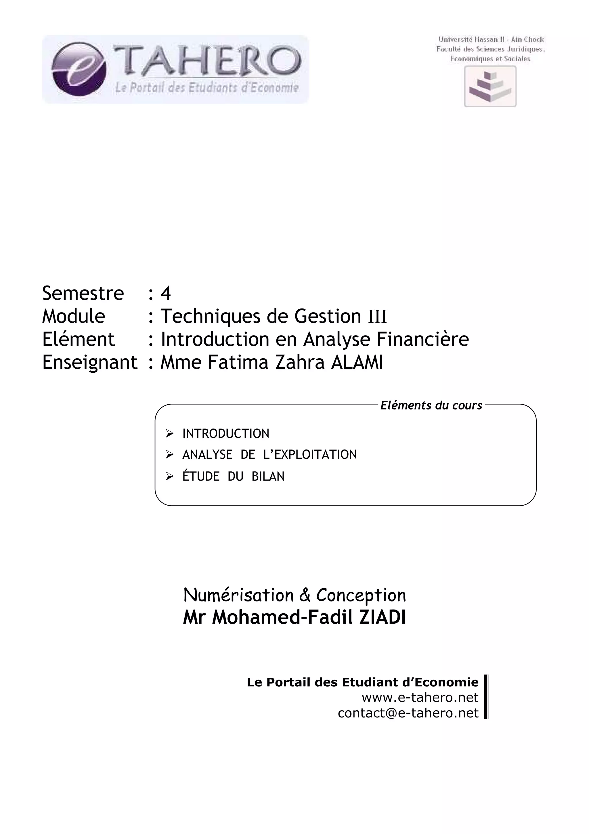 Le document est un cours sur l'analyse financière présenté par Mme Fatima Zahra Alami, comprenant des définitions clés, des règles comptables et des méthodes d'analyse. Il aborde des concepts tels que le bilan, le compte de produits et charges, ainsi que des objectifs de l'analyse financière pour évaluer la santé d'une entreprise. La structure du cours inclut des chapitres sur l'analyse de l'exploitation et l'étude du bilan fonctionnel, avec des exercices pratiques pour illustrer les concepts.