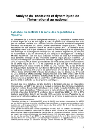 Le document analyse les enjeux et dynamiques climatiques à l'approche de la COP21, soulignant l'inefficacité actuelle des engagements multilatéraux face à l'urgence du changement climatique. Bien que des efforts nationaux soient observés dans certains pays émergents, tels que la Chine et le Brésil, les actions restent insuffisantes et manquent de cohésion internationale. La question des financements et des pertes et dommages devient centrale dans les négociations, révélant des tensions entre pays développés et pays en développement, rendant nécessaire un réexamen profond des accords futurs.