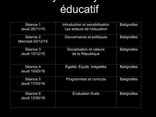 Le document analyse l'évolution du système éducatif français, en mettant l'accent sur les concepts d'égalité, équité et inégalités d'accès à l'éducation. Il retrace l'histoire des réformes scolaires depuis la Révolution française jusqu'à nos jours, soulignant les efforts pour démocratiser l'enseignement tout en constatant les inégalités persistantes. Enfin, il évoque des dispositifs récents visant à promouvoir l'égalité des chances et l'inclusion scolaire.