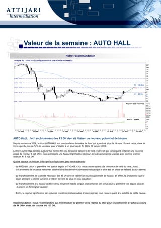 L'analyse technique du titre Auto Hall recommande d'acheter à 94 dh, anticipant une hausse vers 105 dh après une longue phase baissière. Plusieurs signaux techniques indiquent une reprise, dont un MACD positif et un franchissement de niveaux clés. La solidité des volumes soutient cette perspective haussière.