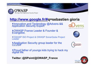 Le document présente l'utilisation de SonarQube pour améliorer la sécurité des applications, en mettant l'accent sur l'analyse de code source et la détection de vulnérabilités. Il décrit les mécanismes d'intégration de SonarQube dans le cycle de développement logiciel et présente le projet OWASP dédié à optimiser l'analyse de sécurité avec SonarQube. L'auteur souligne que SonarQube fonctionne mieux avec une politique de codage sécurisé établie et qu'il nécessite encore le développement de plugins et de profils spécifiques pour une meilleure couverture de la sécurité.
