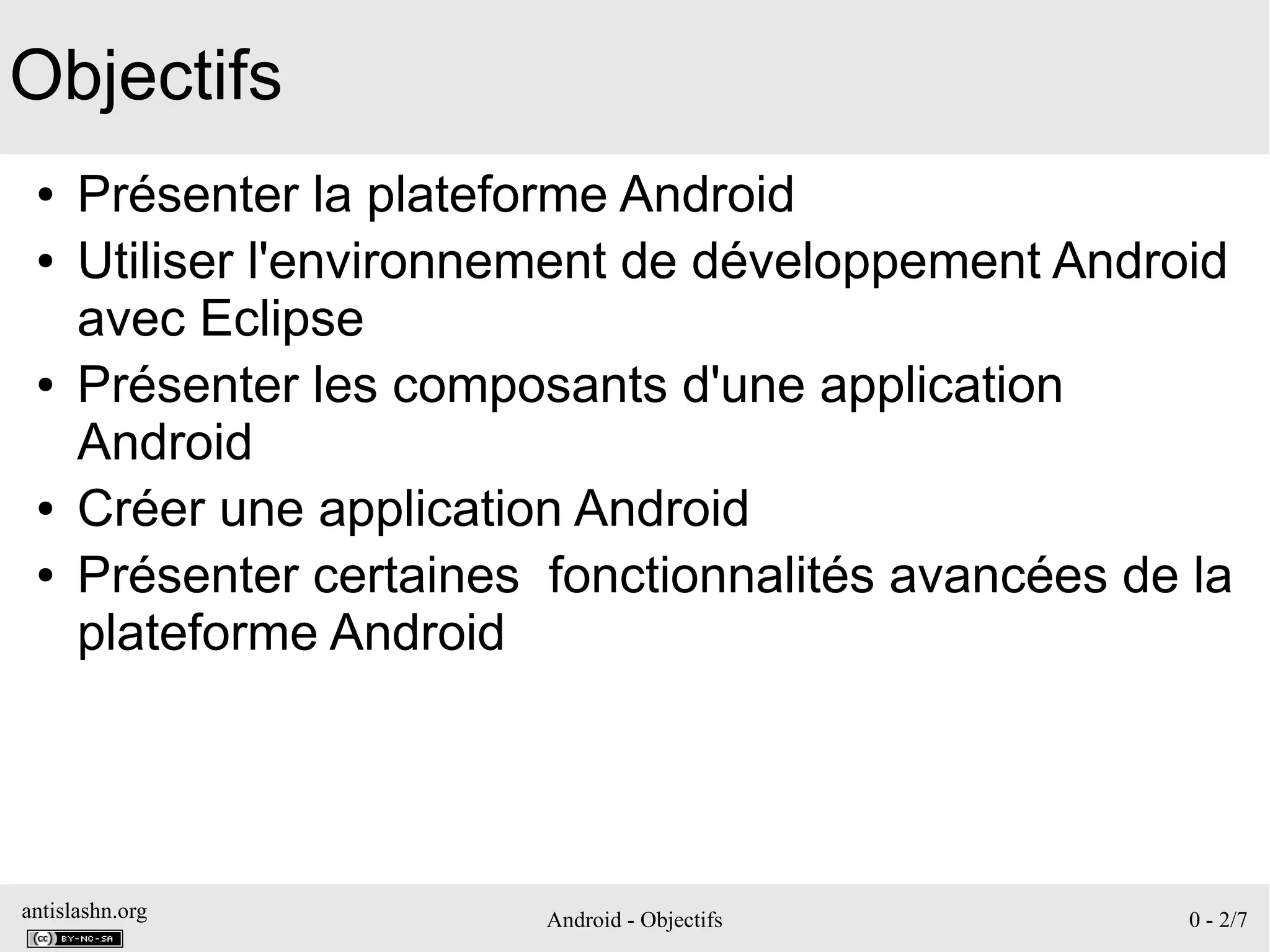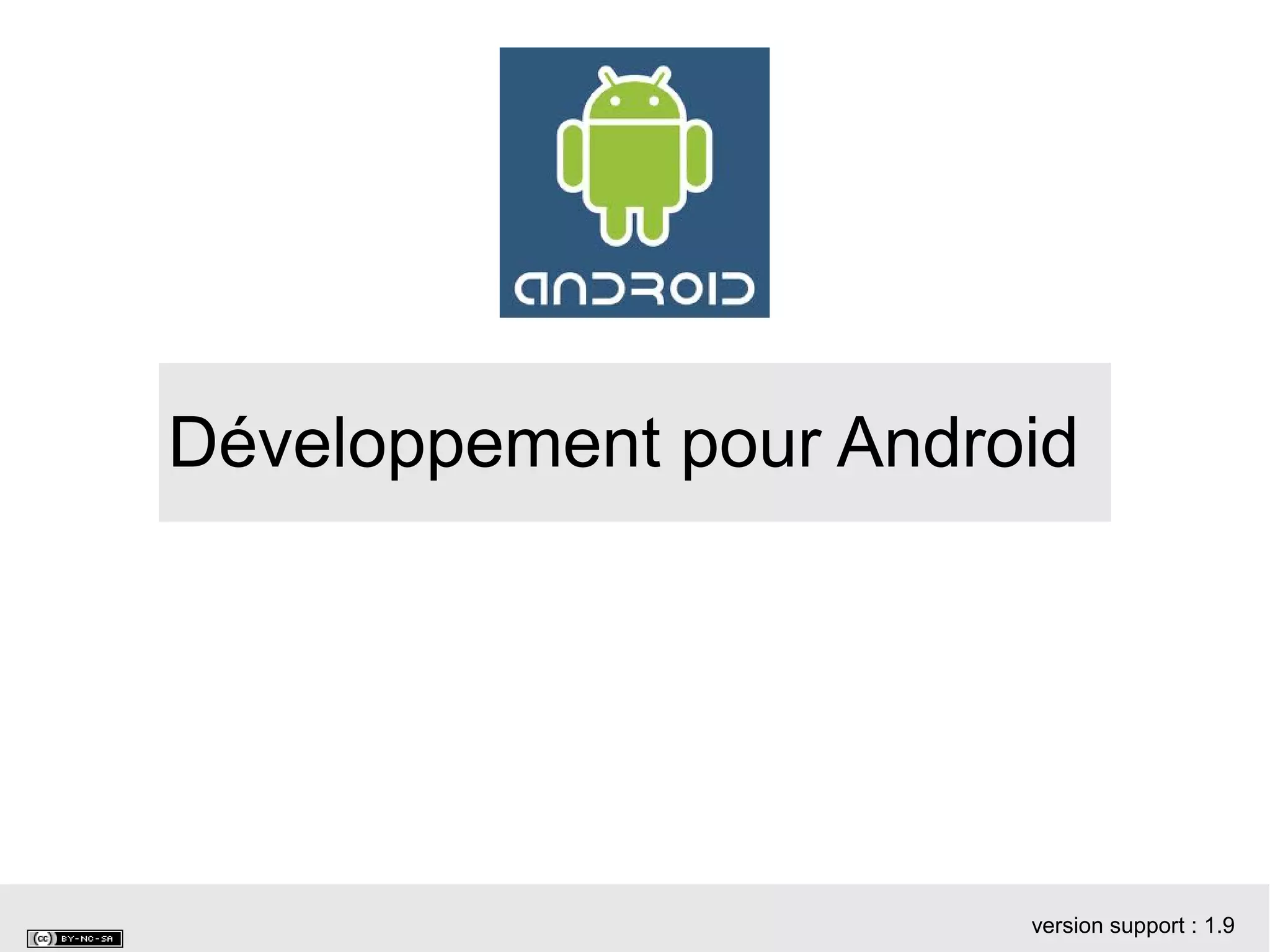 Ce document présente les objectifs, chapitres et outils nécessaires au développement d'applications Android. Il couvre des aspects tels que la plateforme Android, les composants d'une application, et les outils de développement comme Eclipse et Android Studio. De plus, il traite de l'historique des versions d'Android et de la configuration d'un environnement de développement.