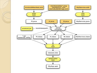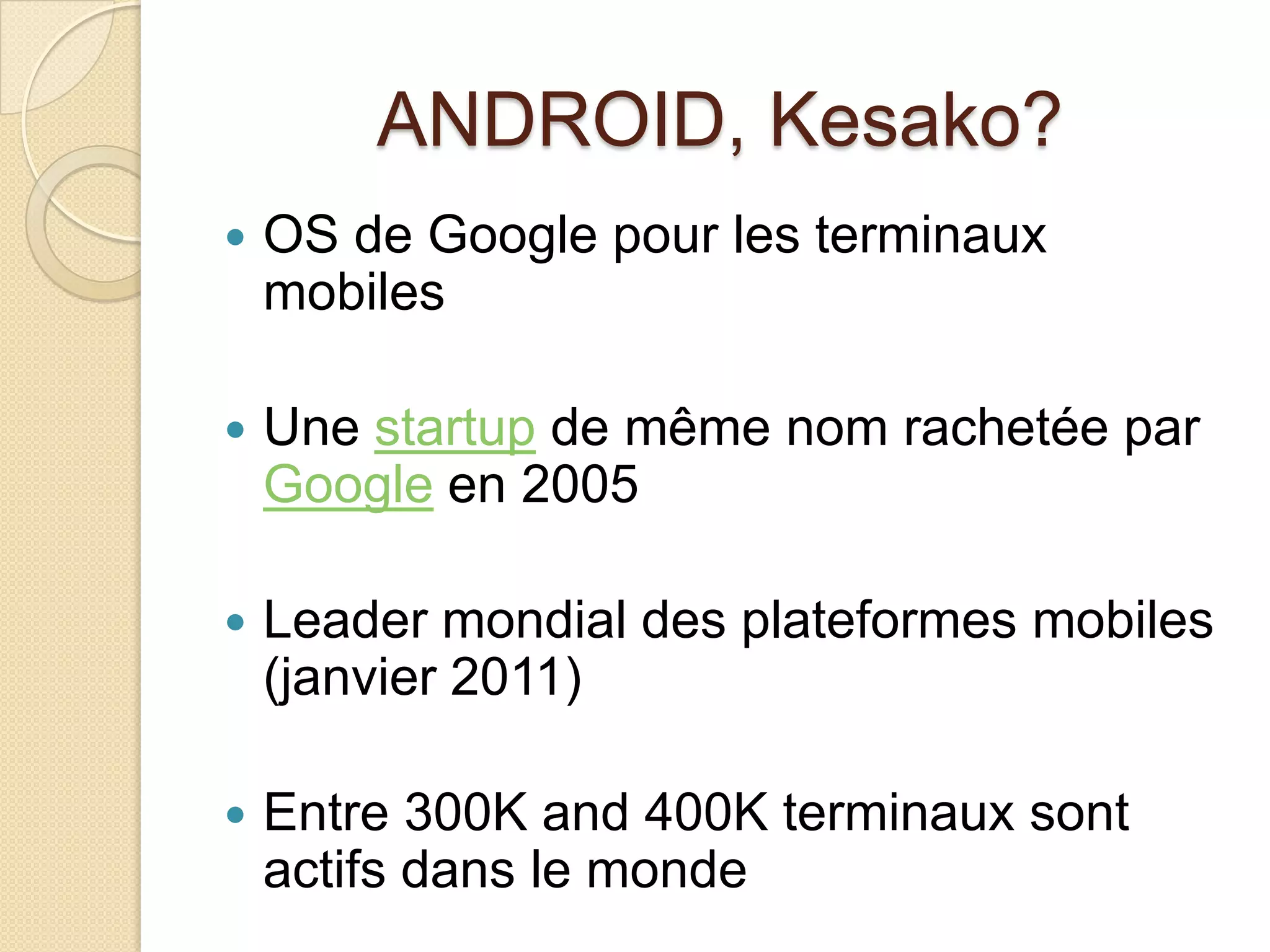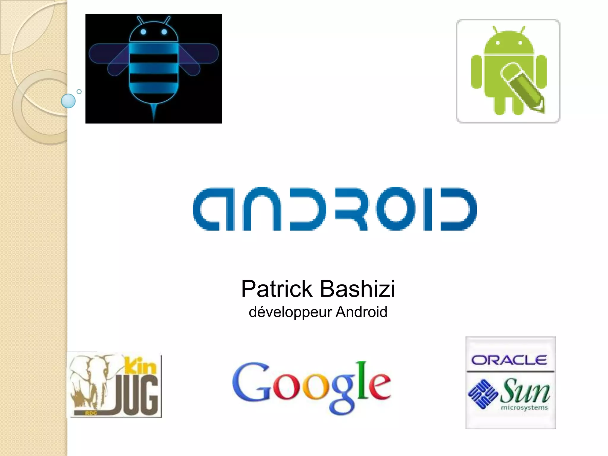Patrick Bashizi présente Android, un système d'exploitation mobile développé par Google, qui se distingue par sa nature open source et son architecture favorable à l'innovation. Avec des millions d'appareils actifs et un large éventail d'applications, Android repose sur des composants comme l'activité, le service et le contenu, intégrés dans un environnement de développement robuste. Le document détaille également l'historique, le modèle économique, les versions et les étapes de développement d'applications Android.