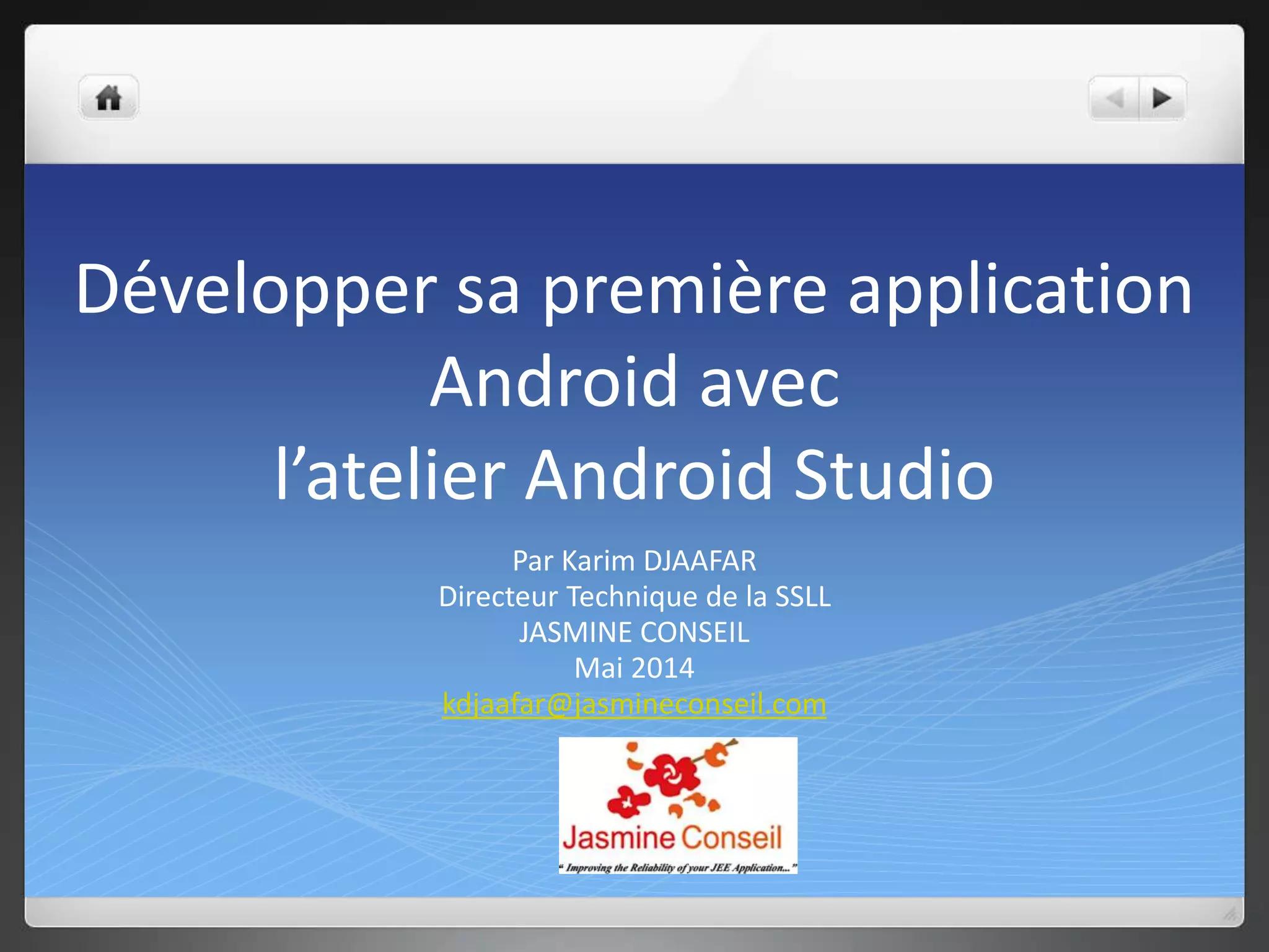 Le document présente un atelier sur le développement d'applications Android avec Android Studio, notamment la configuration de l'environnement et la création d'une application Hello World. Il couvre les composants fondamentaux d'Android, les solutions de développement disponibles, ainsi que les étapes pour démarrer un projet, configurer l'émulateur et lancer l'application. En outre, il inclut des informations techniques sur les exigences préalables et les différentes activités de projet dans Android Studio.