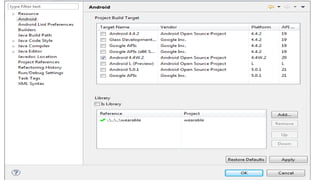Le document décrit les étapes nécessaires pour développer des applications pour Android Wear, y compris la configuration de l'environnement de développement et la création de notifications. Il explique comment installer les bibliothèques requises et configurer un émulateur pour tester les applications. Enfin, il donne des exemples de code pour créer une application simple qui génère des notifications sur une montre connectée.