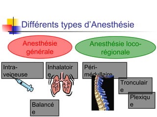 Le document traite des différents types d'anesthésie, y compris l'anesthésie générale, locale et combinée, ainsi que des aspects réglementaires et des considérations de sécurité liées à ces procédures. Il aborde également l'évaluation préopératoire des patients, les risques associés, et les techniques d'anesthésie, soulignant l'importance de la surveillance à chaque étape de l'anesthésie et du réveil. Enfin, il présente les procédures de suivi post-anesthésie et les critères de sortie pour garantir la sécurité des patients.