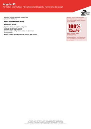 Certyou propose une formation de 4 jours sur AngularJS, visant à maîtriser le développement d'applications web performantes pour des webmasters ayant déjà des connaissances en HTML et JavaScript. Le programme couvre l'architecture MVVM, la gestion des événements, les tests et le debug, ainsi que des notions avancées comme la gestion des appels REST et l'internationalisation. La formation inclut un coaching après-cours et se déroule dans plusieurs villes, incluant une garantie de satisfaction à 100%.