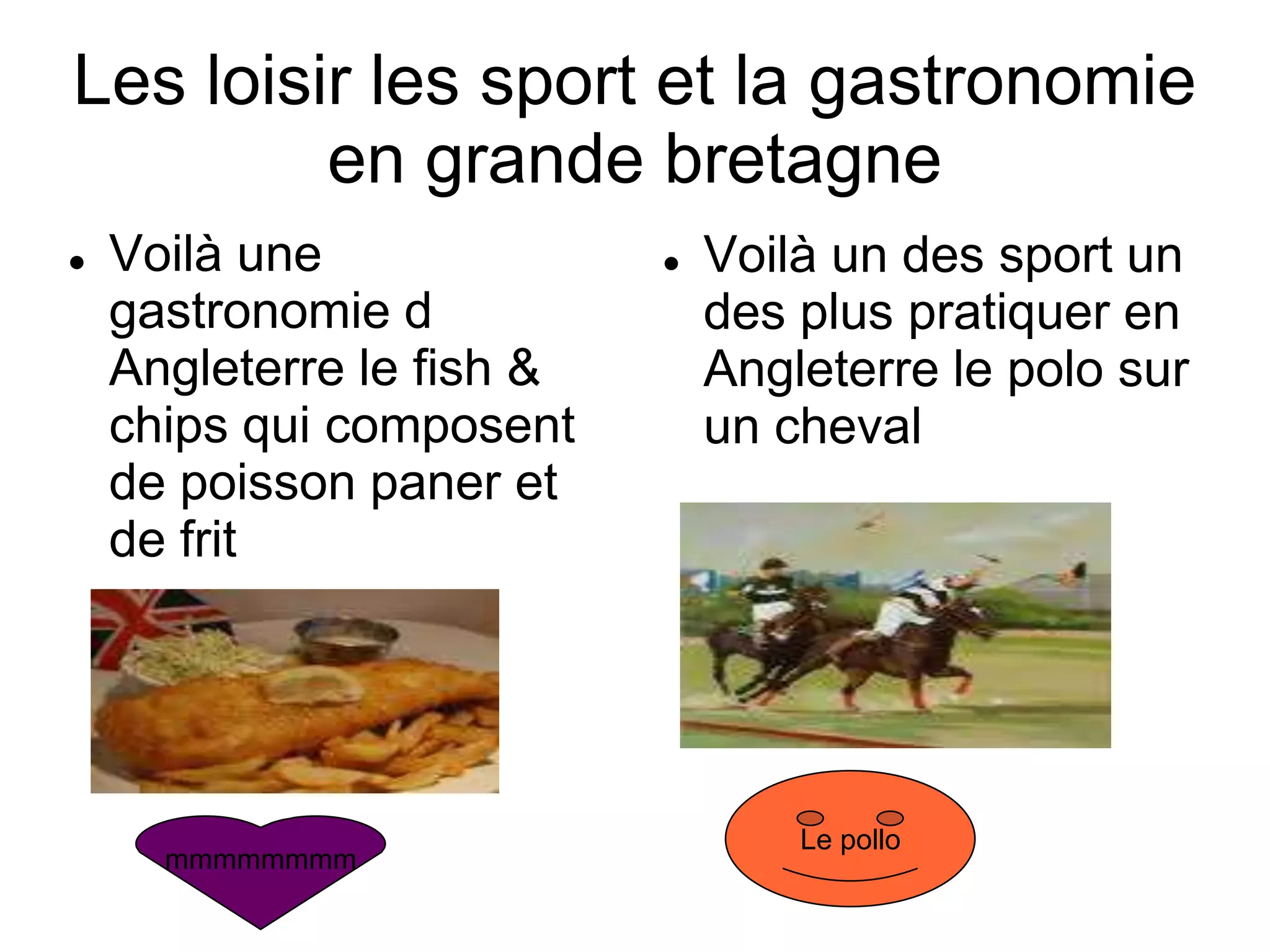 Le document évoque les loisirs, les sports et la gastronomie en Grande-Bretagne, mettant en avant des plats typiques comme le fish & chips et le petit déjeuner anglais copieux. Il mentionne également des sports populaires tels que le football, le polo et le golf. D'autres éléments gastronomiques incluent le fromage anglais et le pain traditionnel.