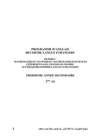 Le document présente le programme d'anglais pour la troisième année de l'enseignement secondaire en Algérie, précisant les finalités, objectifs et compétences à développer chez les élèves. Il vise à renforcer les compétences linguistiques, méthodologiques et socio-culturelles des apprenants, tout en intégrant une approche par compétences pour favoriser leur engagement. L'enseignement de l'anglais comme deuxième langue étrangère s'inscrit dans une politique nationale éducative visant à préparer les élèves à un monde moderne et interconnecté.