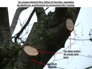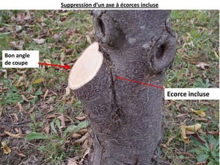 Le document aborde l'importance des techniques de coupe dans l'entretien des arbres, spécifiant que celles-ci doivent être nettes et précises pour éviter les dommages. Il évoque les conséquences d'une mauvaise coupe, telles que la dégradation des tissus de bois et la formation de pourriture. L'accent est mis sur la compartimentation, qui isolent les tissus altérés après les blessures.