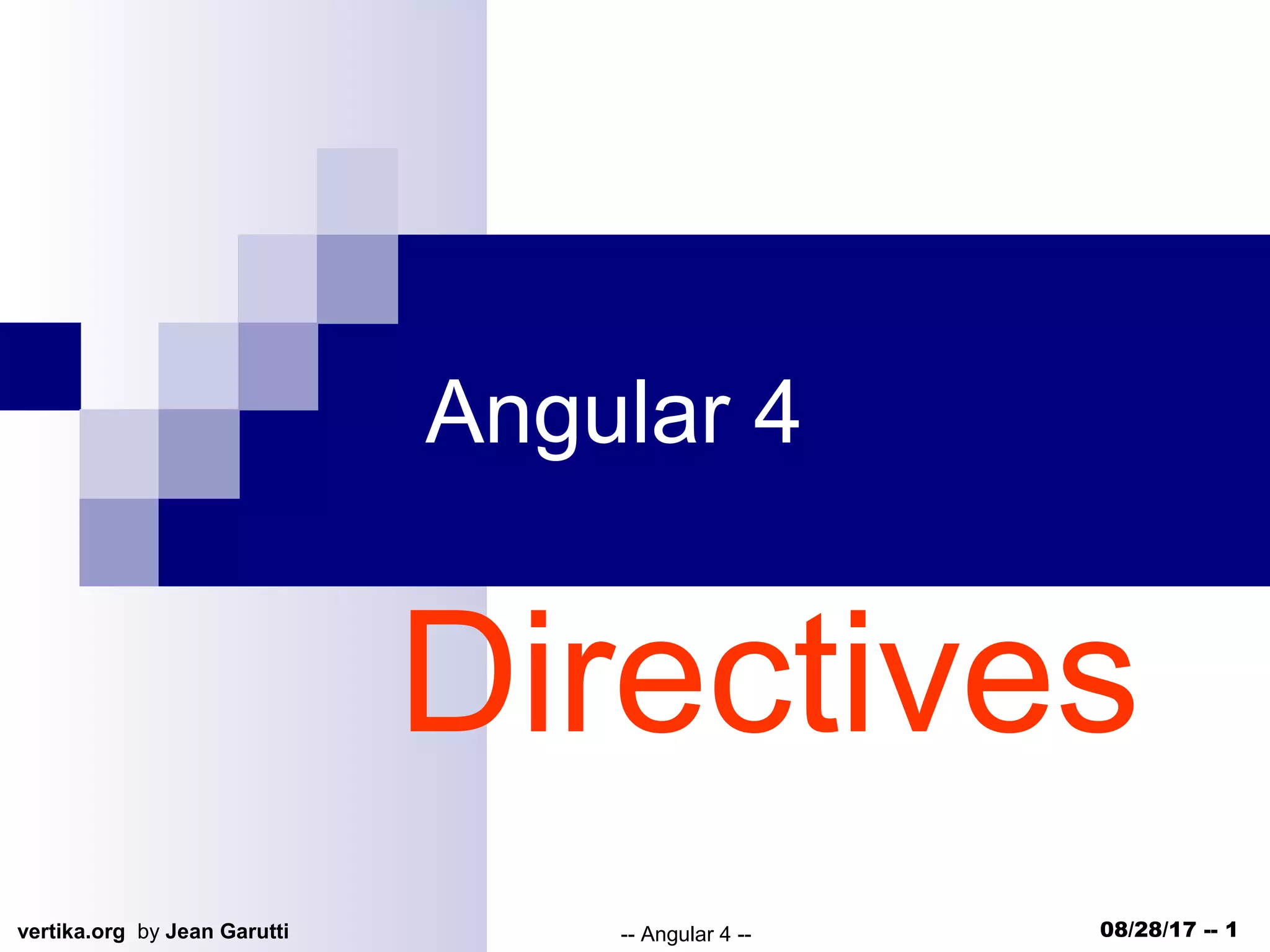 Le document discute des types de directives en Angular 4, notamment les directives structurelles, attributs et composants. Chaque type a des fonctions spécifiques; par exemple, les directives d'attribut modifient l'apparence et le comportement des éléments, tandis que les directives de composants utilisent le shadow DOM pour créer des widgets UI encapsulés. Il mentionne également des possibilités de formation en présentiel ou en e-learning sur Angular 4.