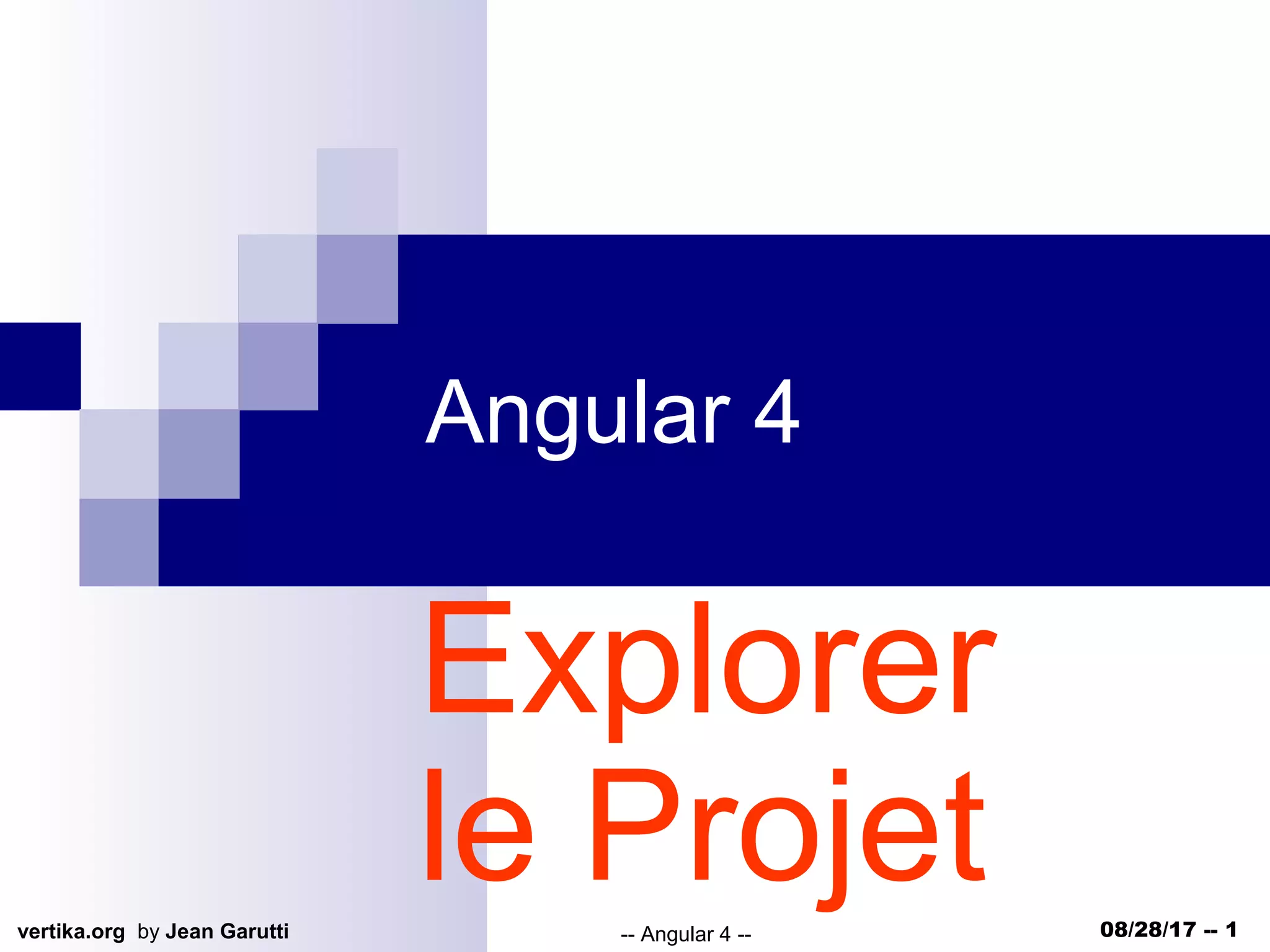 Le document présente un projet basé sur Angular 4, développé par Jean Garutti, incluant des éléments nécessaires pour l'exploration et la gestion (CRUD) du projet. Il fournit une structure HTML pour l'application et des liens vers des ressources pour débuter avec Angular. Le projet semble offrir des cours en présentiel ou en e-learning en plusieurs langues.