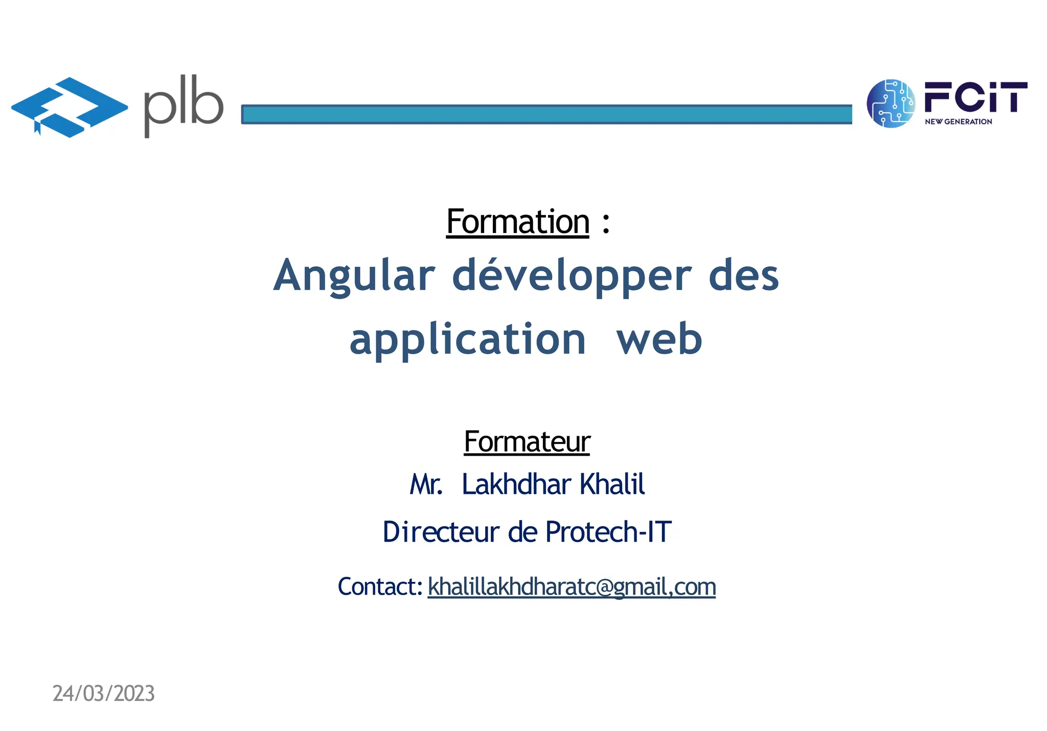 La formation Angular dirigée par Mr. Lakhdhar Khalil couvre les principes fondamentaux d'Angular, le langage TypeScript, ainsi que le développement et le déploiement d'applications web. Les participants apprendront à utiliser les composants, services, routage et gestion des événements d'Angular pour créer des applications modernes et réactives. Des connaissances de base en JavaScript et en informatique sont requises pour aborder ce cours.
