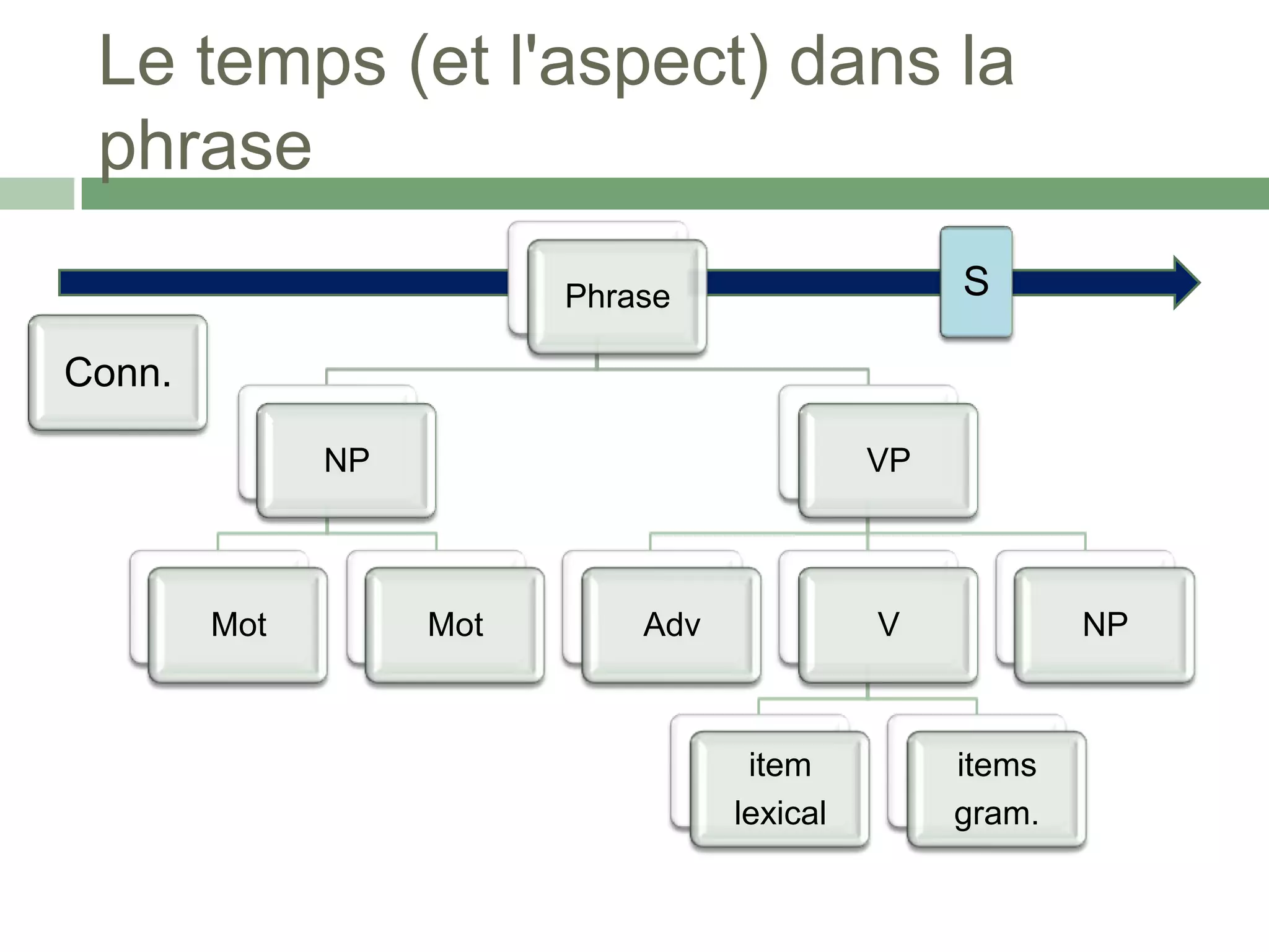 Le document traite de la temporalité dans les phrases, incluant des états, événements et activités. Il illustre ce concept avec des exemples de la vie quotidienne de Marie, qui monte dans un train et commence une nouvelle vie. La structure temporelle est essentielle pour comprendre le lien entre les actions et leur séquence.