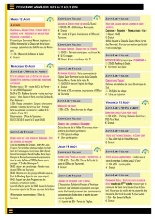 Le programme d'animation du 9 au 17 août 2014 à Saint-Lary comprend des visites guidées du patrimoine architectural et des églises, des animations familiales et des concerts gratuits. Des activités comme des jeux, des marchés, des expositions artistiques et des animations dans la nature sont également prévues, avec des événements gratuits pour les enfants et les adultes. Les inscriptions sont recommandées pour certaines activités limitées en nombre de participants.
