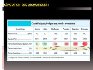 Le document traite de la production et de la séparation des hydrocarbures aromatiques, notamment le benzène, le toluène et les xylènes (BTX), à partir de procédés comme le reformage catalytique et le vapocraquage. Il détaille les différentes étapes de transformation et purification des aromatiques dans des complexes aromatiques, ainsi que les techniques utilisées telles que l'extraction liquide-liquide et la distillation extractive. Les données de production mondiale en 2008, ainsi que les applications industrielles des principaux aromatiques, sont également présentées.