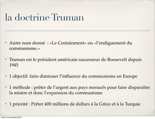 Le document aborde les principaux événements de 1947 marquant le début de la guerre froide, notamment la doctrine Truman visant à endiguer le communisme en Europe, le plan Marshall pour soutenir financièrement les pays européens, et la réaction soviétique sous Jdanov. Il souligne l'importance de 1947 comme une année charnière qui a transformé l'alliance des vainqueurs de la Seconde Guerre mondiale en un monde bipolaire entre les États-Unis et l'URSS. En outre, il mentionne les acteurs clés de cette période et propose des sujets d'étude liés à ces événements.