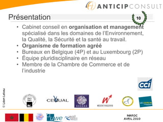 Le document présente un cabinet de conseil spécialisé en organisation et management dans les domaines de l'environnement, qualité, sécurité et santé au travail, avec des bureaux en Belgique et au Luxembourg. Sa mission est d'améliorer durablement la compétitivité des entreprises tout en intégrant des logiques économiques et environnementales à travers divers services comme le conseil, la formation et l'audit. L'organisme se vantent de plus de 250 projets réalisés dans divers secteurs, mettant l'accent sur leur approche transversale et leur expérience internationale.