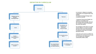 Le curriculum est un outil d'éducation formelle et informelle qui définit les objectifs et les contenus d'apprentissage en fonction des besoins sociaux et culturels. Il englobe les finalités, les méthodes pédagogiques et les modalités d'évaluation, et sa conception reflète un projet d'école ancré dans une réalité éducative. La distinction entre le curriculum prescrit et le curriculum réel, ainsi que les formes plus informelles de curriculum, souligne les écarts entre les intentions éducatives et leur mise en œuvre pratique.