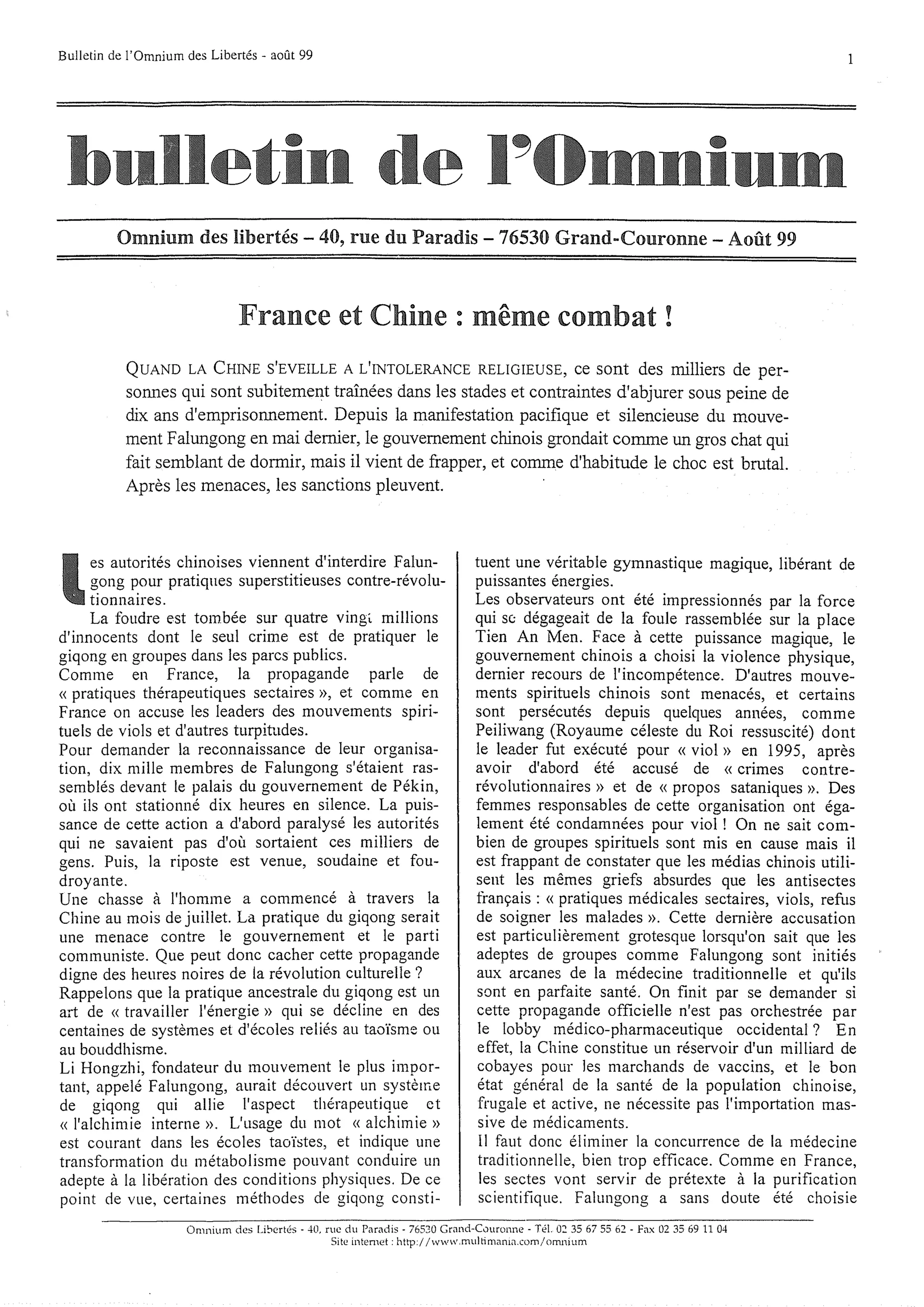 Le bulletin d'Omnium des Libertés d'août 1999 évoque la répression des mouvements spirituels en Chine, notamment le Falungong, et compare cette situation à la persécution des médecines douces en France. Il décrit la violence du gouvernement chinois à l'égard de ceux qui pratiquent des techniques comme le qigong et souligne l'influence néfaste des lobbys médicaux sur les politiques. Le texte dénonce une chasse aux sorcières contre des pratiques traditionnelles, tant en Chine qu'en France, en utilisant les accusations de sectarisme pour justifier des répressions.