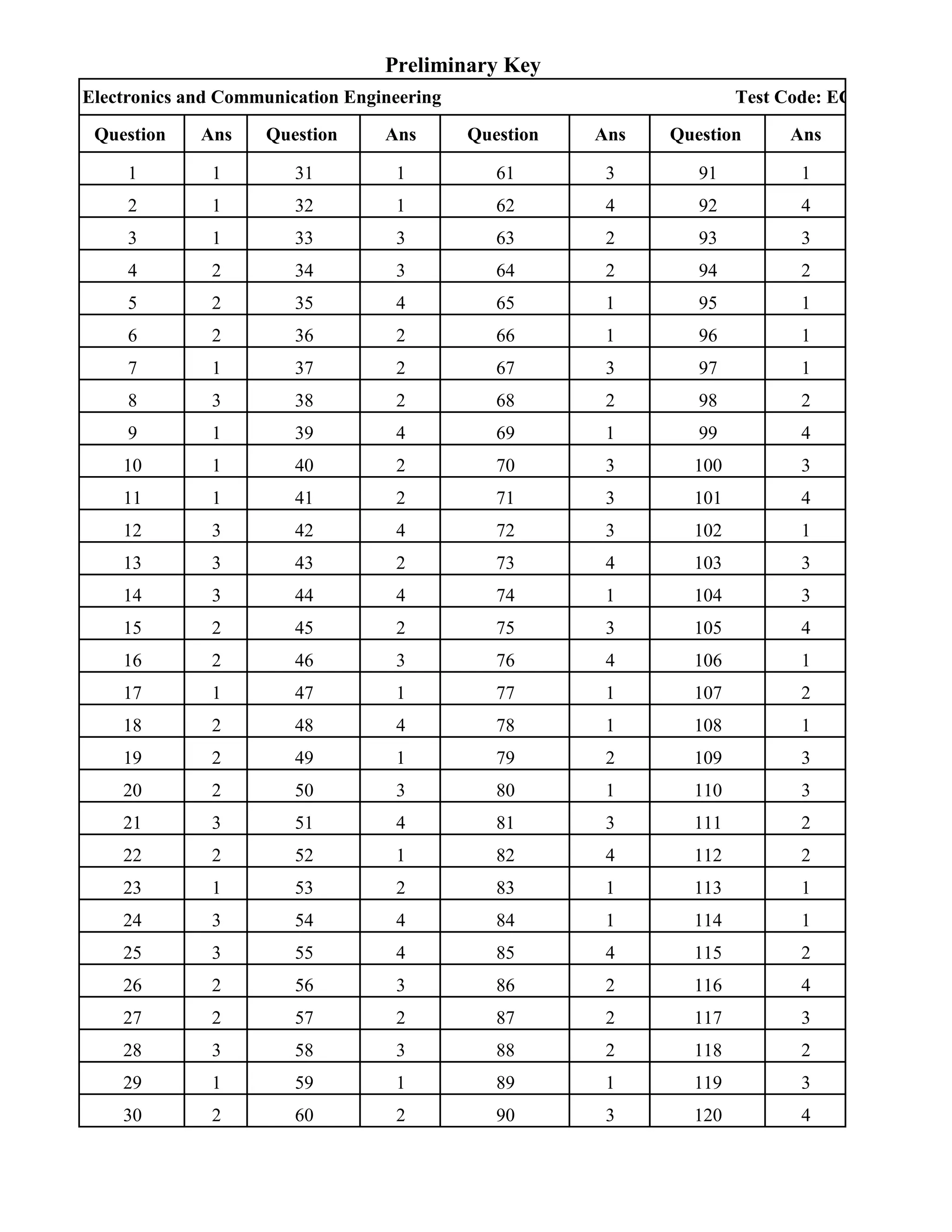 Le document contient une série de questions et réponses numérotées dans le cadre d'un test pour le domaine de l'électronique et de la communication. Les questions sont accompagnées de réponses et classées par ordre, servant probablement de clé pour une évaluation préliminaire. Il est spécifiquement identifié comme le code de test 'ec' et une clé préliminaire.