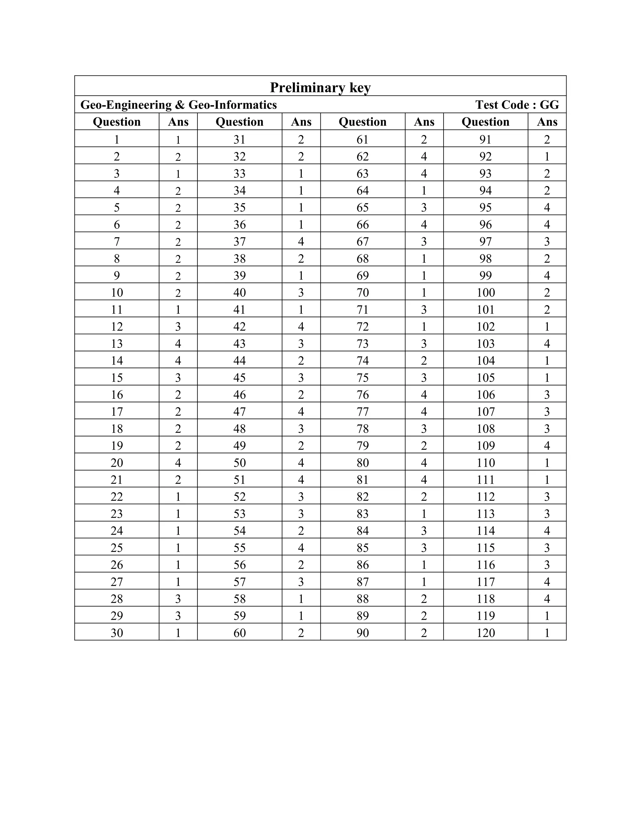 Le document contient une série de questions et de réponses présentant un code de test préliminaire sur la géo-ingénierie et la géoinformatique. Chaque question est accompagnée d'une numérotation et d'un code associé, indiquant des réponses spécifiques. L'ensemble semble structuré pour évaluer des connaissances ou des compétences dans le domaine.