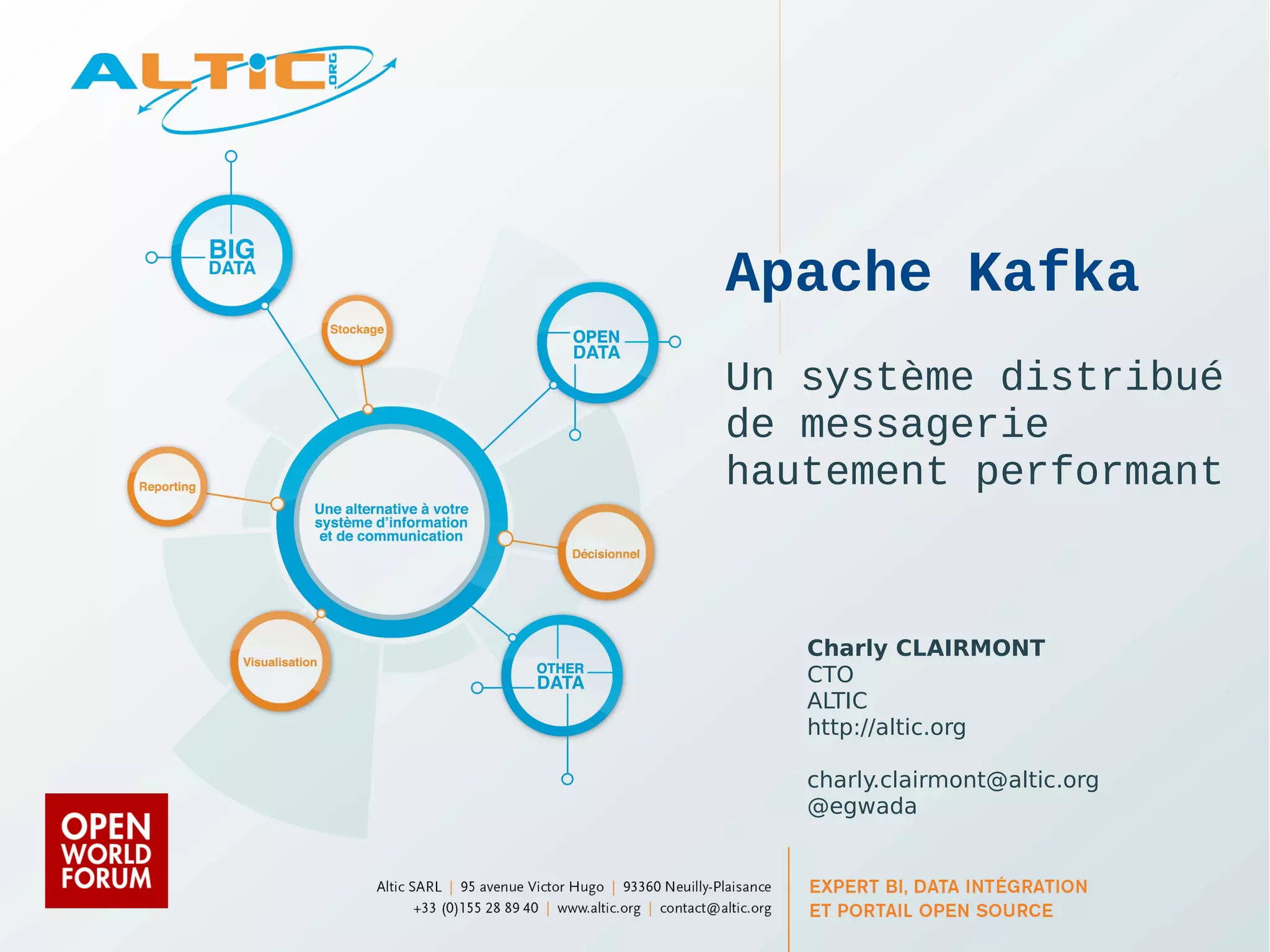 Apache Kafka est un système de messagerie distribué, rapide et tolérant aux pannes, développé à l'origine chez LinkedIn et devenu un projet Apache depuis 2012. Il permet la publication et l'abonnement à des flux de données, avec des cas d'utilisation variés allant de l'agrégation de logs à la surveillance en temps réel. Son architecture repose sur des concepts clés tels que les topics, partitions et brokers, offrant une grande scalabilité et performance dans le traitement des données.