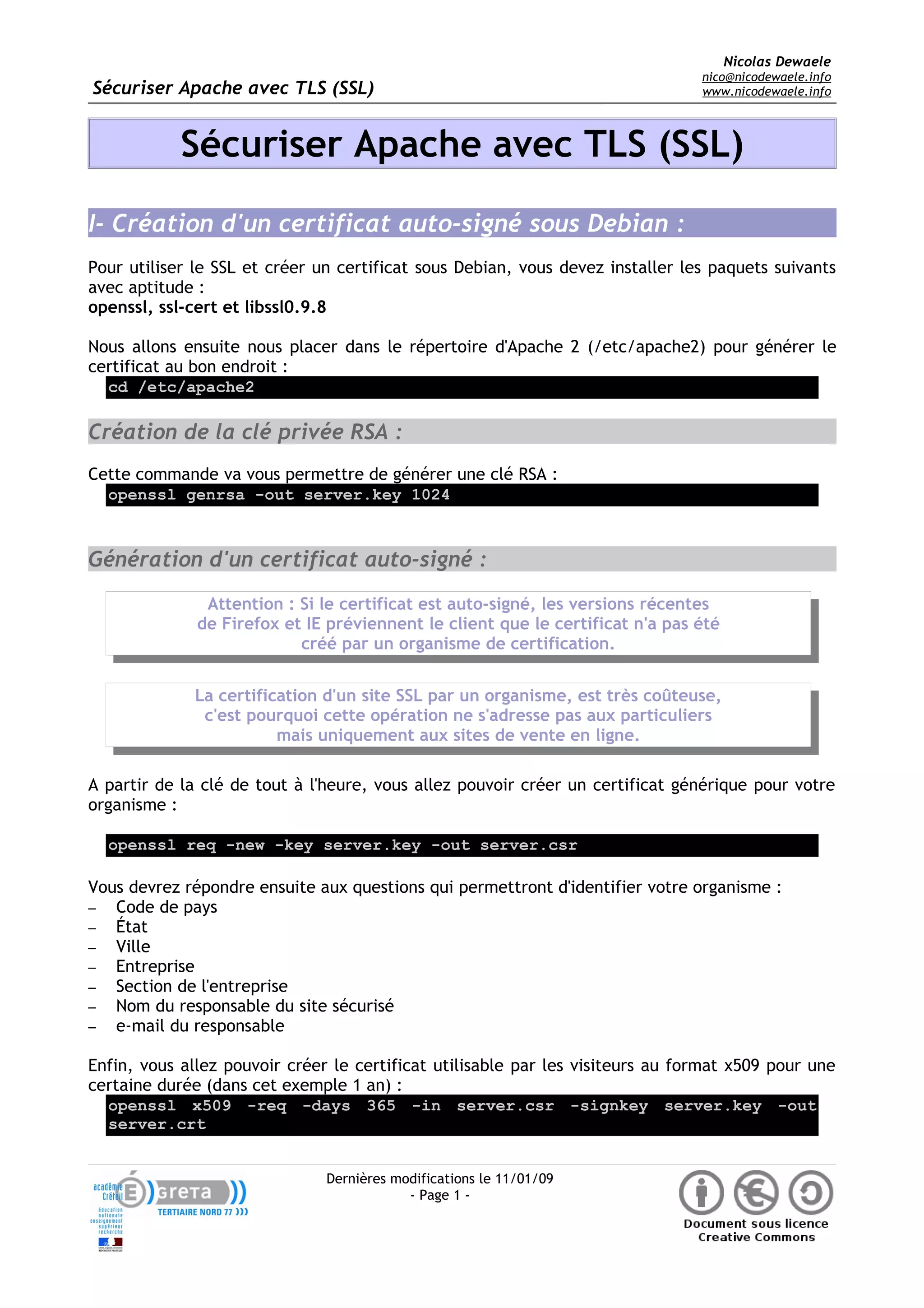 Ce document décrit les étapes pour sécuriser un serveur Apache avec TLS/SSL en créant un certificat auto-signé sous Debian. Il couvre la génération d'une clé RSA et d'un certificat, l'activation du module SSL dans Apache, ainsi que la configuration d'un nouveau site virtuel. Enfin, il suggère de tester le serveur sécurisé via HTTPS, en notant que des avertissements apparaîtront en raison du certificat auto-signé.