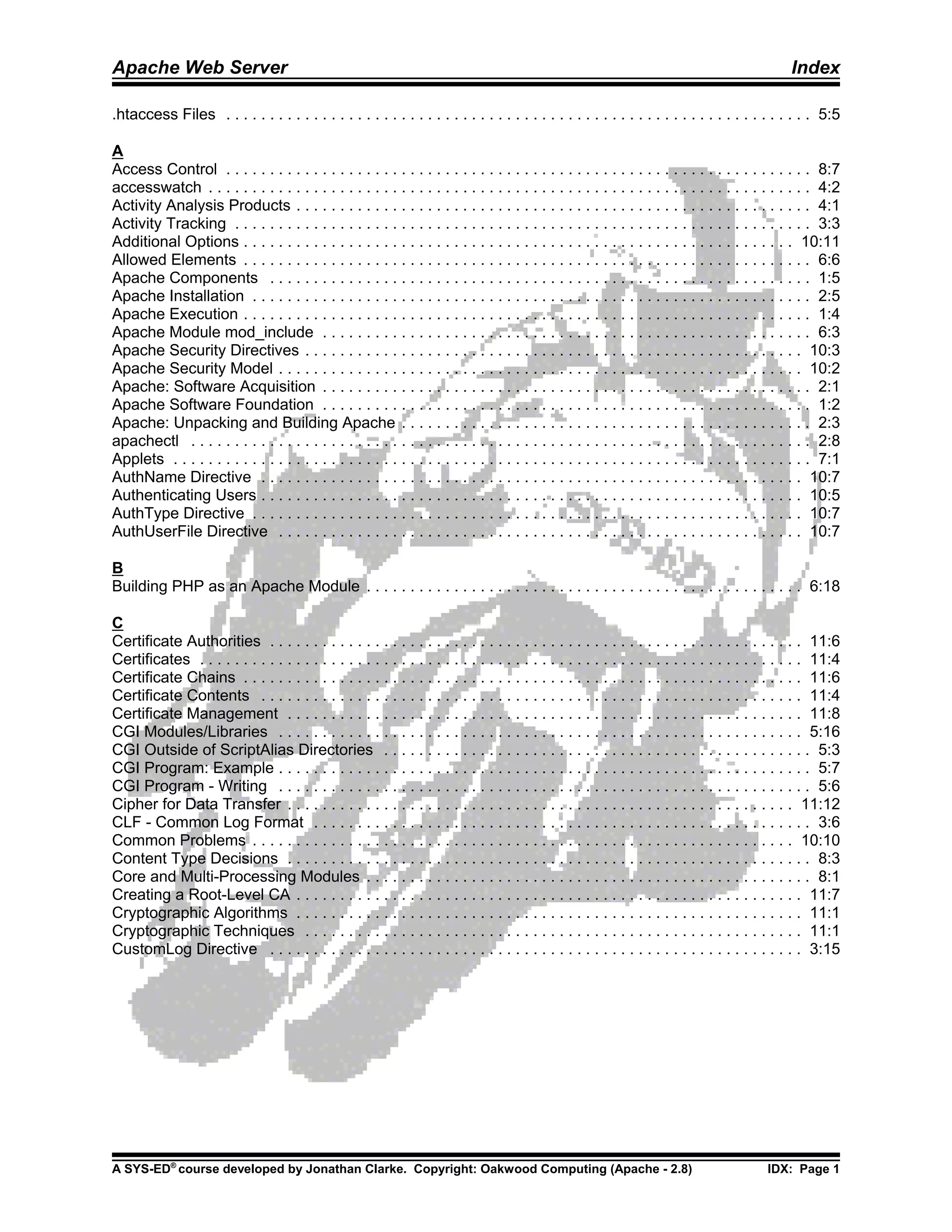 Le document porte sur le serveur web Apache et couvre divers sujets concernant son installation, son exécution et ses directives de sécurité. Il aborde également les modules, les certificats de sécurité, et le traitement du contenu dynamique. Enfin, il décrit les éléments comme les fichiers .htaccess et les méthodes d'authentification des utilisateurs.