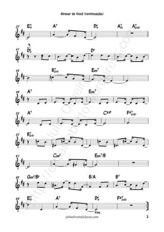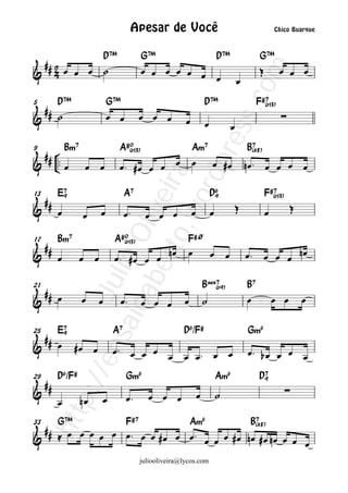 Le document présente une analyse musicale de la chanson 'Apesar de Você' de Chico Buarque. Il inclut des notations et des indications musicales, ainsi que des références à des interprétations et des variations. La structure de la chanson est décrite à travers des accords et des motifs mélodiques.