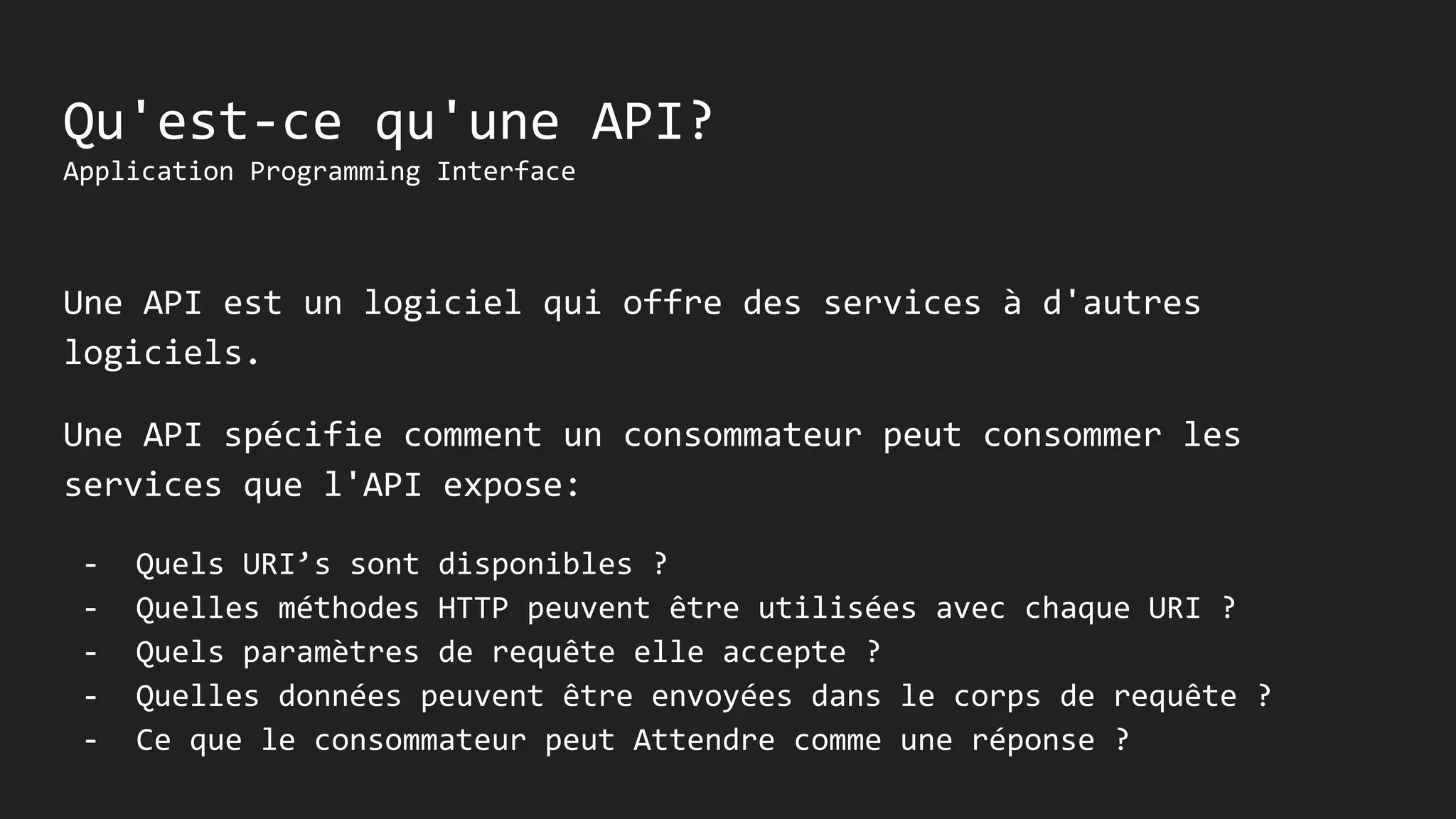 Une API (Application Programming Interface) offre des services à d'autres logiciels, spécifiant l'accès aux ressources via des URI et des méthodes HTTP. Les API web sont divisées en RPC et REST, le modèle de maturité de Richardson décrivant les niveaux d'implémentation pour les API REST. Les bonnes pratiques incluent la gestion des codes HTTP, la négociation de contenu et l'utilisation de la sécurité telle que SSL et OAuth2.