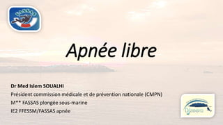 Le document présente l'apnée sous-marine, ses mécanismes physiologiques et les disciplines associées, ainsi que les risques de syncope liés à cette pratique. Il décrit les lois physiques qui gouvernent l'apnée et donne des conseils sur la sécurité, incluant la prévention de la syncope. Enfin, il souligne l'importance de la connaissance de soi et le respect des règles pour profiter pleinement de l'apnée.