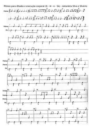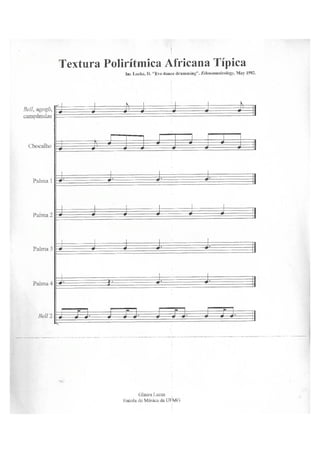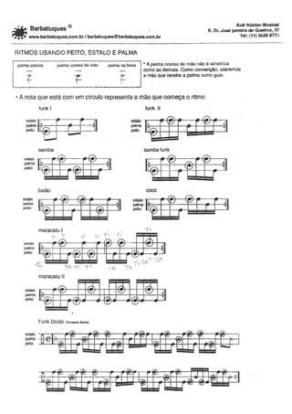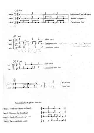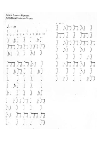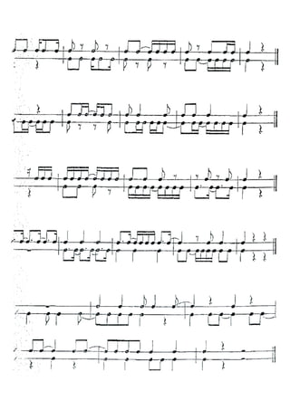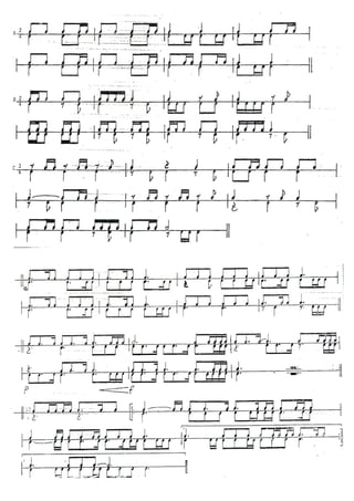 Le document semble être une apostille sur les rythmes de percussion et la formation musicale, comprenant une liste d'exercices et de pièces à interpréter. Il inclut également des notes et des indications sur la dynamique et l'organisation des ensembles instrumentaux. Les exercices sont conçus pour aider les étudiants à développer leurs compétences en direction et en participation à des groupes de musique.