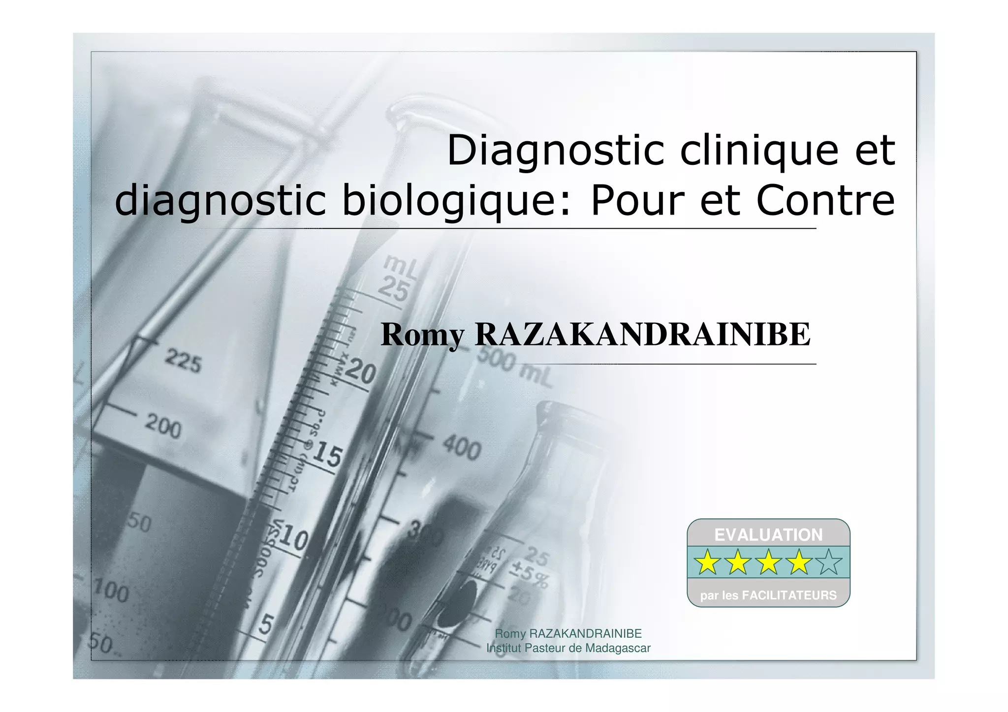 Le document examine le diagnostic clinique et biologique du paludisme à Madagascar, mettant en évidence les avantages et inconvénients de diverses méthodes, y compris les algorithmes cliniques et les diagnostics biologiques tels que la microscopie et les tests antigéniques. Il souligne l'importance d'un diagnostic précis pour éviter le surdiagnostic et le traitement inapproprié, surtout dans les zones d'endémie. Enfin, il insiste sur la nécessité de prioriser des méthodes fiables pour le diagnostic afin d'améliorer la prise en charge des patients.